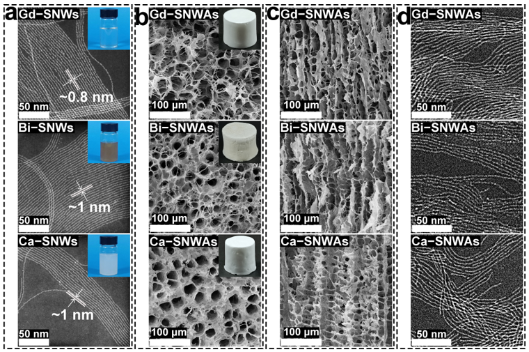 亚纳米线(SNW)由于其极小的尺寸而具有许多令人着迷的性质,这些性质使它们近几年被科研工作者们广泛关注。然而,如何将SNWs构筑成能够保持其结构特征和物理化学性质的宏观功能材料(如气凝胶)是一个巨大挑战。因为目前已报道的SNWs的性质与传统超临界干燥或冷冻干燥制备气凝胶的技术并不兼容。针对这一挑战,赛华征教授基于SNW的独特分散性,提出了一种采用高熔点非极性溶剂(即环己烷)为介质,经冷冻铸造来制备亚纳米线气凝胶(SNWA)的方案(图1)。所制备的SNWA不仅展现了SNW大量的物理和化学性质,而且在光致发光领域具有很大的应用潜力。尤其是这里采用的亚纳米线可以由稀土盐为原料来合成,为地方稀土资源的开发利用提供了新思路。