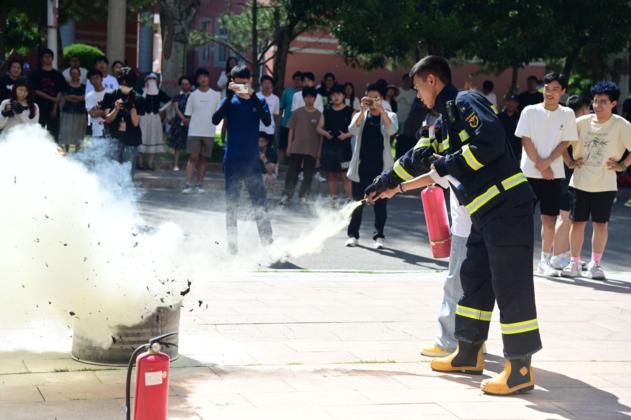 第二环节为灭火器讲解与实操。消防员讲解了灭火器种类、适用范围及使用方法。在耐心且专业的指导下,现场师生实操体验扑灭初期火灾。