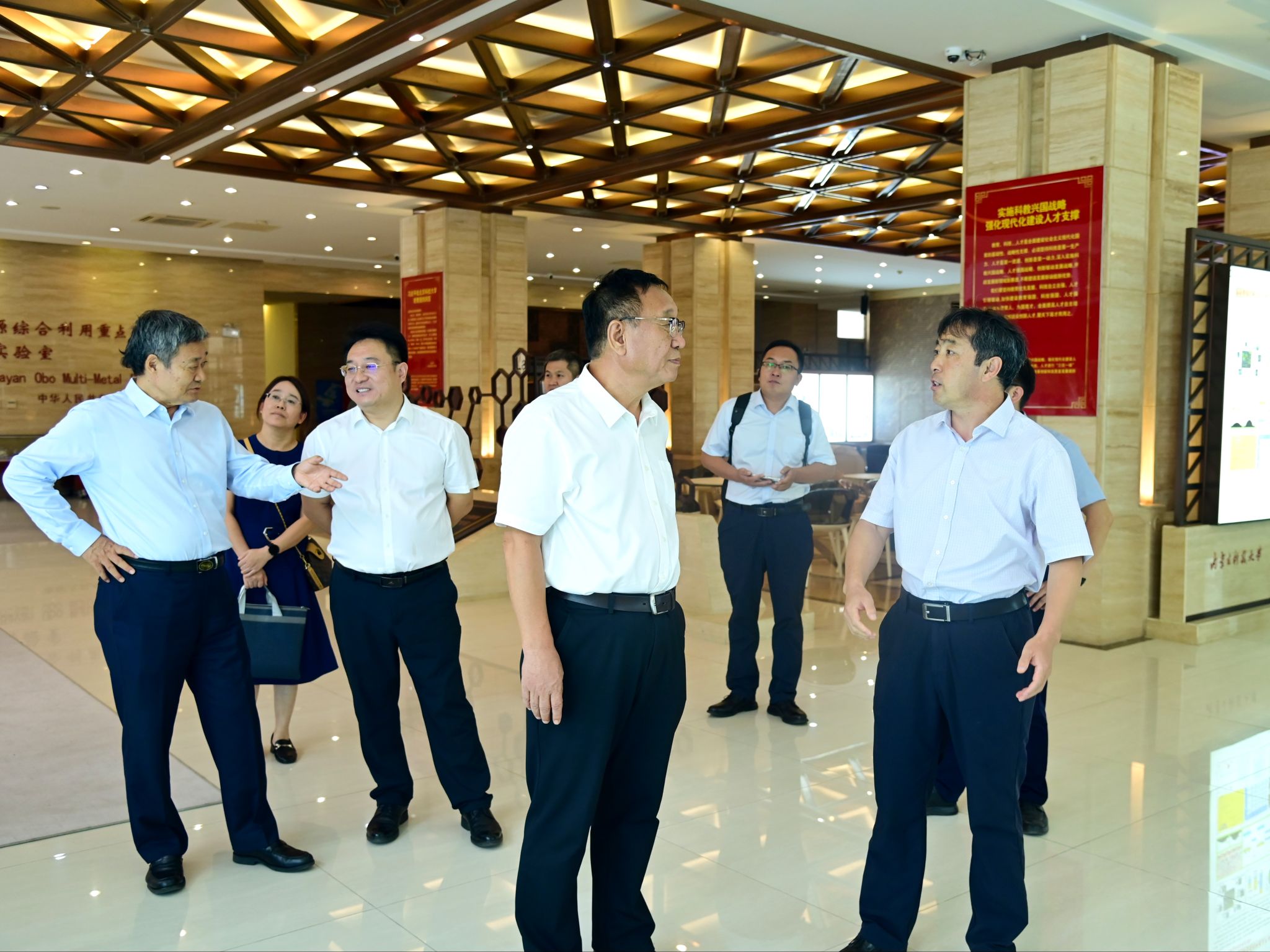 9月4日,中国稀土学会理事长李波、副理事长兼秘书长杨占峰一行为学校“稀土科普教育基地”挂牌,并调研交流。包钢(集团)公司党委常委、副总经理兼包头稀土研究院党委书记、董事长刘振刚,党委常务副书记李波,副院长申孟林,校党委书记呼和,党委副书记、校长韩永全,副校长赵永旺、张新房参加相关活动。