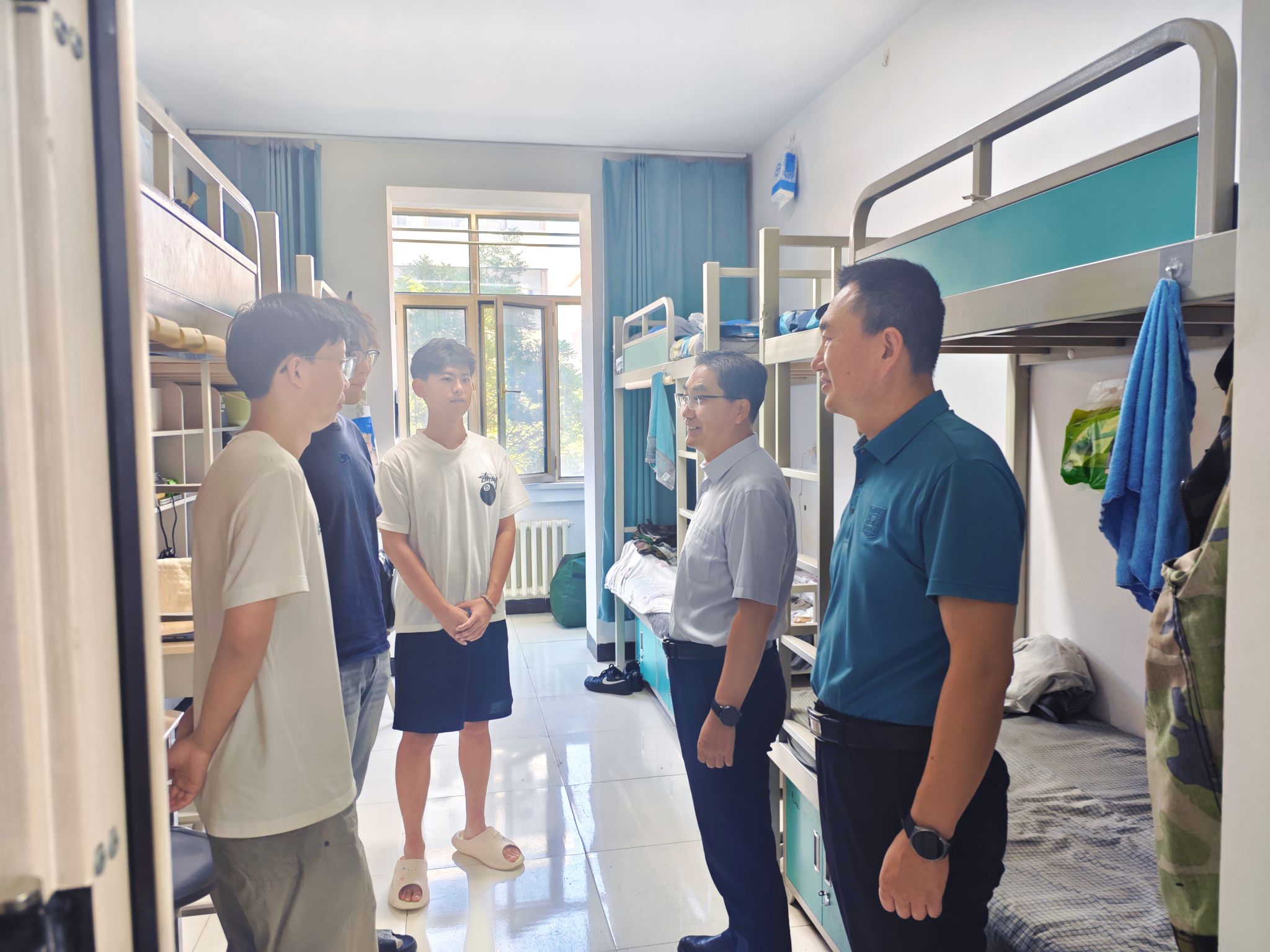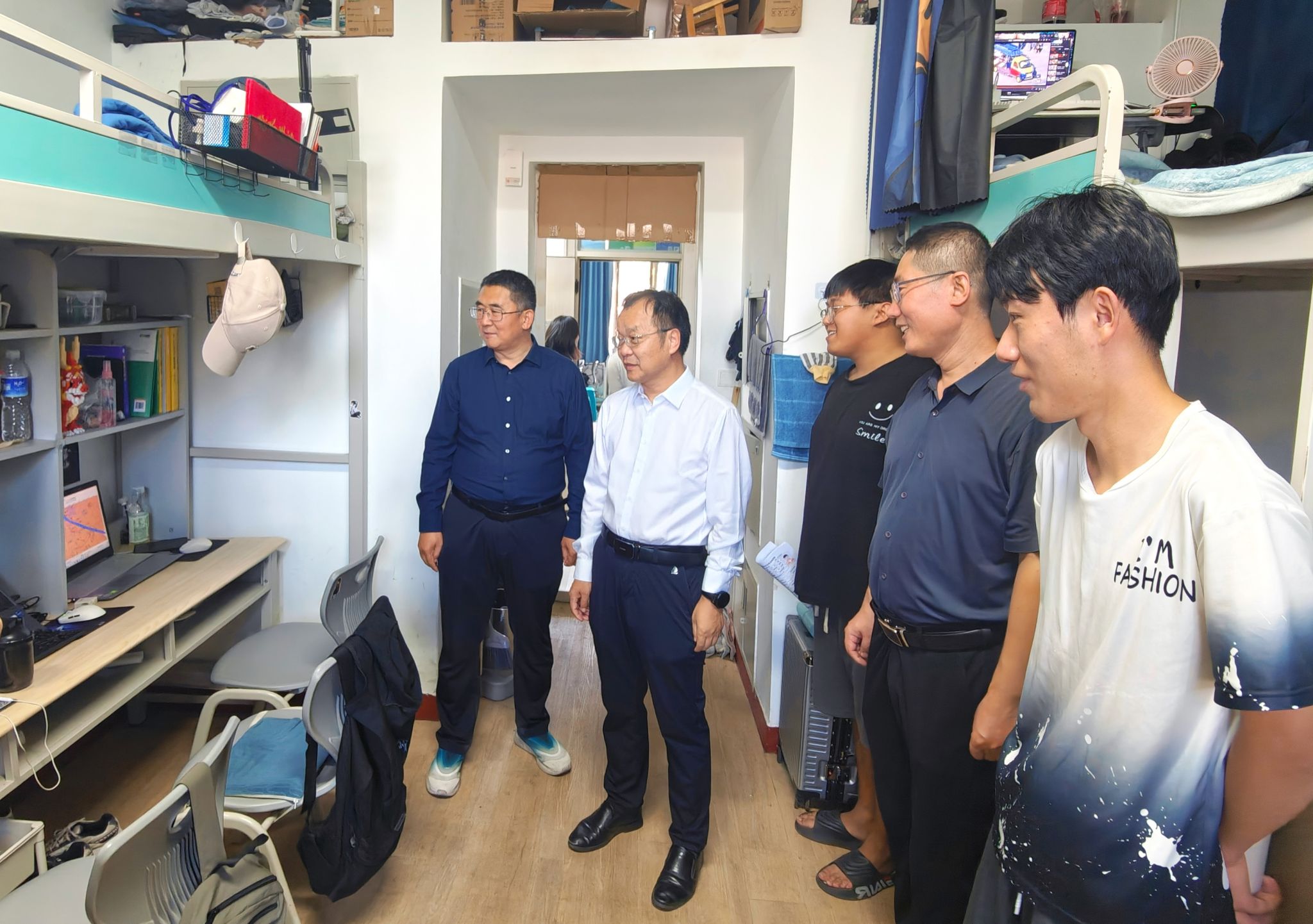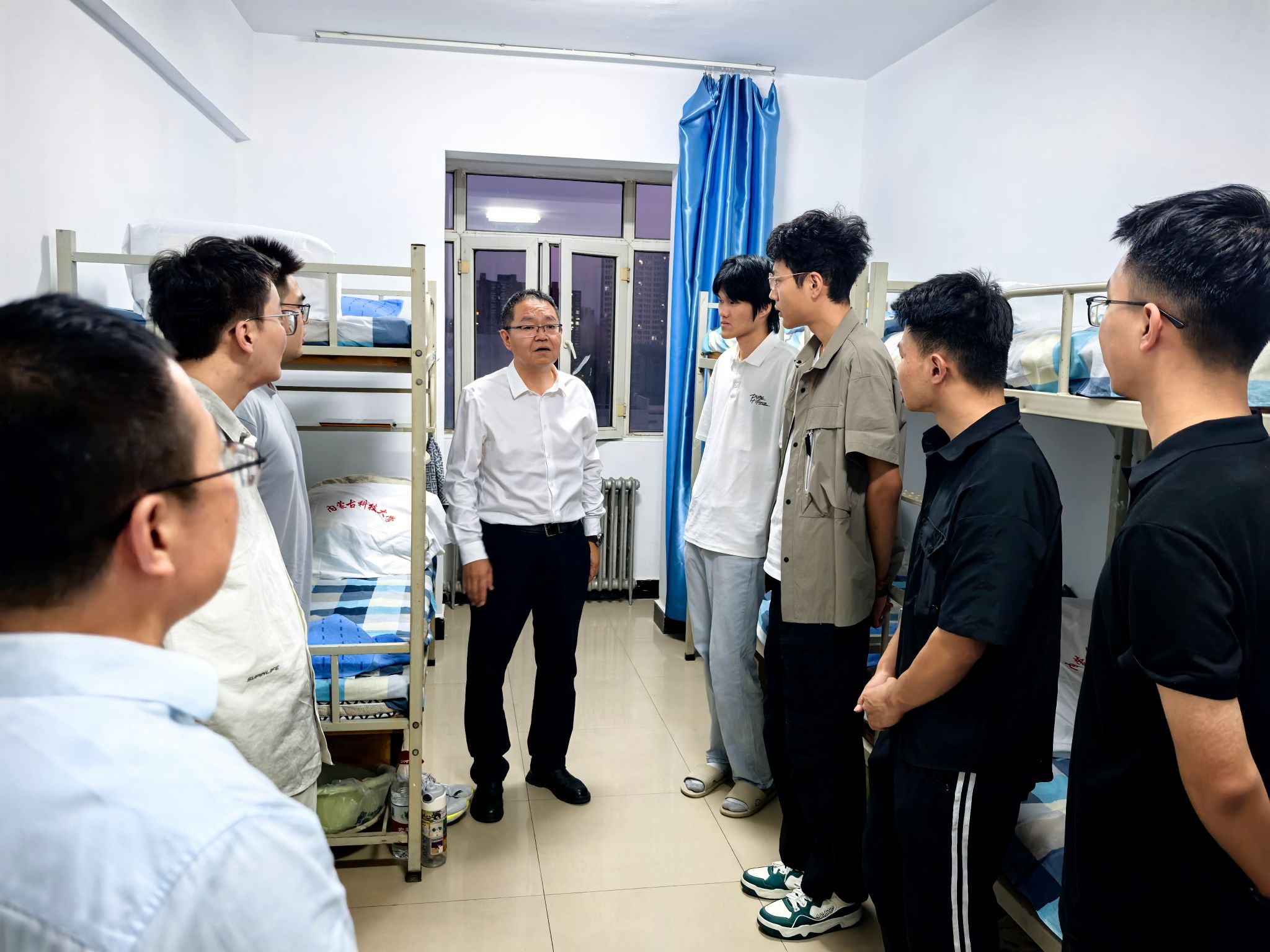 初秋叩寝携关切,关怀伴君启新程。在新生公寓,校领导们与2025级新生亲切交流,细致地询问同学们来自哪里、是否适应新的生活环境、在学习或生活上是否存在困难,耐心听取了同学们对校园基础设施、餐饮住宿等方面的初步感受和建议,勉励新生要尽快完成角色转换,适应大学的学习节奏和生活方式,珍惜大学时光,做好学业规划,积极参与校园文化活动,全面提升自身综合素质。同时,对新生公寓内各项安全设施进行专项检查,并就发现的问题提出了整改意见。