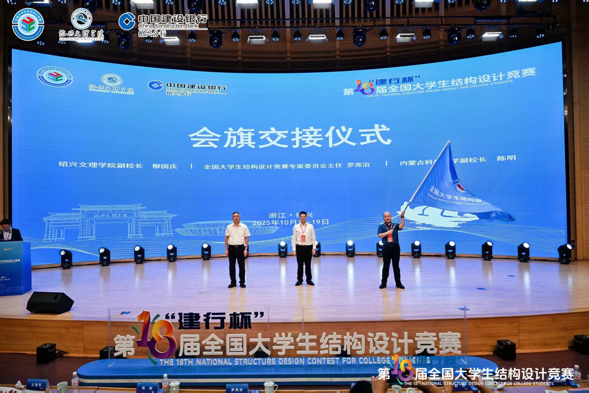 10月19日,在第十八届全国大学生结构设计竞赛闭幕式上,1683168诸侯快讯官网党委委员、副校长陈明从赛事主办方手中接过赛旗,标志着学校全面开启2026年第十九届全国大学生结构设计竞赛的筹备工作。