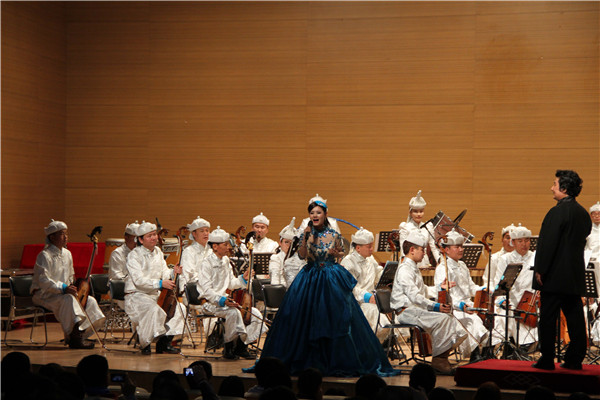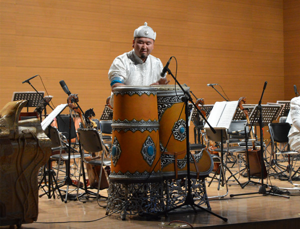 为我们带来此次演出的中国乌审•马头琴交响乐团,该团是国内唯一一支以蒙古族传统乐器马头琴为主弦乐,具有浓郁的民族特色和地方风情的专业多声部交响乐团。这场以《天马神韵》为名的音乐会曾在国家大剧院上演。音乐会以马头琴管弦乐序曲《马背雄风》开场,气势恢宏,一幅辽阔的草原画卷在舞台中央徐徐展开。长调变奏叙述曲《牧歌》仿佛让观众看到了洁白的羊群,奔驰的骏马。马头琴管弦乐曲《北京喜讯》,世界经典曲《査尔达什舞曲》洋溢着浓浓的祝福情,民歌表演唱《送亲歌》、马头琴管弦乐随想曲《鸿雁》表达着草原人民对草原深深的依恋情。