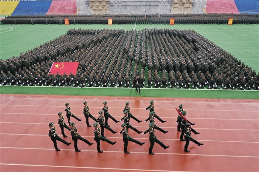 近日,1683168诸侯快讯官网2019级学生军训成果展示暨总结表彰大会现场,近6000名新生分别进行了军训科目会演、阅兵式、分列式等内容,其中,1600名新生组成的方阵摆出了“70”“祖国”“万岁”“百炼”“成钢”等字样,以此表达对中华人民共和国成立70周年的祝福。