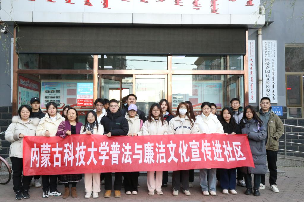 为深入开展精准普法,拓展普法宣传教育“第二课堂”,推进城校融合,在“11·25”国际反家庭暴力日来临之际,学校党委宣传部、纪检监察室和普法维权协会、廉洁文化社师生代表,来到学校对口包联的昆都仑区友谊大街锦绣嘉园社区,开展普法与廉洁文化宣传教育活动。