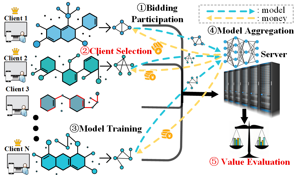 近年来,图联邦学习(Federated Graph Learning, FGL)技术因其能够在保护数据隐私的前提下,允许客户端利用本地私有数据集进行模型训练,并仅将训练后的模型梯度上传至中心服务器,从而有效保障原始数据的安全性,受到了广泛关注。然而,现有研究往往忽视了客户端在缺乏相应激励的情况下,难以积极参与贡献其本地图数据的现实问题;同时,那些数据质量较低的客户端参与训练时,也会显著影响模型性能。为了应对这些问题,并使其更符合现实应用场景中的经济激励机制,研究提出了一种基于图基序(motif)的反向拍卖算法——AEFGL。AEFGL首次将拍卖理论中的激励机制与图联邦学习相结合,能够评估图结构中独特连接属性的价值,并将其量化为客户端的实际贡献价值;同时,结合反向拍卖机制有效筛选出高质量数据的客户端,从而提升模型训练的整体性能。